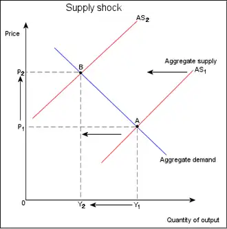 In the short run, an economy-wide negative supply shock will shift the aggregate supply curve leftward, decreasing the output and increasing the price level.[1] For example, the imposition of an embargo on trade in oil would cause an adverse supply shock, since oil is a key factor of production for a wide variety of goods. A supply shock can cause stagflation due to a combination of rising prices and falling output. The 1973 Oil Crisis is often used as the exemplar case of a supply shock, when OPEC restrictions on production and sale of petroleum resulted in fuel shortages throughout the developed world.