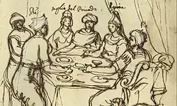 While feasting and indulging in wine are documented in the notable works of Georgian courtly literature such as The Knight in the Panther's Skin and Amiran-Darejaniani, as well as in early travel accounts, the tradition of the toastmaster and the practice of making toasts in a form similar to contemporary customs are noticeably absent during those periods.[4] The Georgian terms for "toastmaster," namely tamada and t’olumbaši, respectively of Circassian and Turkish origin (Turkish: tulumbaş), do not appear in historical records until the 19th century.[4] Additionally, the term "supra" itself, referring to the banquet, is not found, at least as a term for the feast; in the medieval Georgian translation of Ferdowsi's Shahnameh ("The Book of Kings"), supra solely denotes the tablecloth or dining table, mirroring its Persian source, sofre, in the original text.[4] The Georgian expressions for feasting in pre-Tsarist times are identified as nadimi and p’uroba (derived from p’uri meaning "bread," commonly used to encompass all types of food served at a meal).[4]
