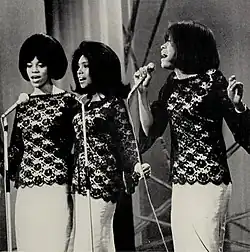 By 1965, the Supremes were international stars. They toured the world, becoming almost as popular abroad as they were in the US.[35][36] Almost immediately after their initial number-one hits, they recorded songs for motion picture soundtracks, appeared in the 1965 film Beach Ball, and endorsed dozens of products, at one point having their own brand of bread. By the end of 1966, their number-one hits included "I Hear a Symphony", "You Can't Hurry Love" and "You Keep Me Hangin' On".[37] That year the group also released The Supremes A' Go-Go, which on October 22 became the first album by an all-female group to reach number one on the US Billboard 200, knocking the Beatles' Revolver out of the top spot.[38] Because the Supremes were popular with white audiences as well as with black ones, Gordy had the group perform at renowned supper clubs such as the Copacabana in New York.[39] Broadway and pop standards were incorporated into their repertoire alongside their own hit songs.[40] As a result, the Supremes became one of the first black musical acts to achieve complete and sustained crossover success. Black rock-and-roll musicians of the 1950s had seen many of their original hit tunes covered by white musicians, with these covers usually achieving more fame and sales success than the originals. The Supremes' success, however, counteracted this trend. Featuring three group members who were marketed for their individual personalities (a move unprecedented at the time) and Diana Ross's pop-friendly voice, the Supremes broke down racial barriers with rock-and-roll songs underpinned by R&B stylings. The group became extremely popular both domestically and abroad, becoming one of the first black musical acts to appear regularly on television programs such as Hullabaloo, The Hollywood Palace, The Della Reese Show, and, most notably, The Ed Sullivan Show, on which they made 17 appearances.[30] In 2003, Fred Bronson wrote that in 1959, when the Supremes formed as the Primettes, "no one could have predicted they would become the most successful American singing group of all time."[41]