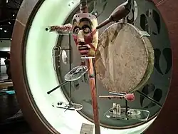 The museum's main gallery features a permanent exhibit titled "Ancient Shores – Changing Tides" that showcases drawings, documents, and historic photographs related to the Suquamish Tribe, contemporary and historic crafts, and interpretative panels and multimedia elements.[8] The centerpiece of this exhibit is a 300-year-old carved canoe that was last used in the 1989 Paddle to Seattle, the first of a now annual series of canoe journeys through the Salish Sea undertaken by tribal members.[9] A second gallery is used to house rotating exhibits from the museum's permanent collection, or items on loan from other museums, including traveling exhibits from the Smithsonian Institution Traveling Exhibition Service (SITES). Exhibits have included a SITES display "Native Words, Native Warriors", chronicling the history of Native Americans in the U.S. armed forces.[10]