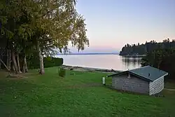 On Dye's Inlet, there was a village at Chico Creek. This village had one shed-roof house, but Synder's Suquamish informants did not remember whether it was built before or after settlers came to Puget Sound.[35] Nearby, on Erland's Point, there was a large gable-roof longhouse that was built around 1880 and was possibly the last-standing Suquamish longhouse.[36] Barbara Lane also wrote that there was a village on Phinney Bay as well.[28]