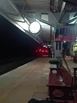 Surathkal railway station (Station code:SL) is one of the main railway stations of Mangalore city along with Mangalore Central railway station and Mangalore Junction railway station and is located in north Mangaluru on Konkan Railway route. Twenty-two trains stop here.KRCL operates RO-RO services from Suratkal to Verna, Kolad, and Karembeli.[1][2] As per the Konkan railway map, Surathkal railway station is at a distance of 733.825 kilometers from the northern starting point of the Konkan railway line at Roha and 4.615 kilometers from Thokur which is the southern endpoint of Konkan railway jurisdiction.[3] The Surathkal railway station is at distance of 26.285 Kilometre from Mangaluru Central(MAQ) railway station.[4]
