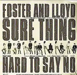"Sure Thing" is a song written and recorded by American country music duo Foster & Lloyd. It was released in September 1987 as the second single from their self-titled debut album. It reached number 8 on both the Billboard Hot Country Songs chart and the Canadian RPM country Tracks chart in 1987.