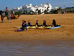 In the 1960s, European and American expatriates began surfing in Taghazout Bay. Historical records also suggest that American servicemen stationed at Kenitra (formerly Port Lyautey) introduced surfboards to Morocco as early as the early 1960s, particularly at Mehdia Beach near Kenitra.[1] In the decades since, a surf industry has arisen in coastal areas of Morocco such as Agadir and Essaouira.[2] The Moroccan government invested in seaside tourism infrastructure in Taghazhout Bay surf village as part of the 2001 Azur Plan, with the aim of creating 20,000 jobs for local people.[3] Winter is generally the high season for surf tourism in Morocco.[4] In Moroccan culture, surfing is generally considered a masculine sport, and women surfers challenge cultural norms in taking part.[5][2]
