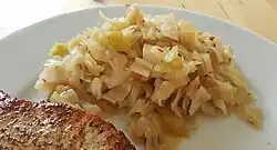 The cabbage is finely sliced and slowly cooked with caraway and cumin seeds, apple, vinegar, sugar, salt and butter. Surkål is usually served together with pork. Surkål is not to be mistaken for sauerkraut as it does not go through a fermentation process.[2]