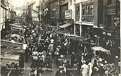 Although much of the old marketplace triangle was built up by the 19th century, a small open space remained on Market Street, immediately behind the Butter Market building, and this became the main focus of street trading. However, in 1893 the entire triangle (by this date known as Middle Row) was comprehensively cleared and redeveloped by Croydon Corporation.[9] This development pushed all street trading activities into Surrey Street.