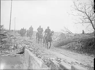 III Corps was heavily engaged in the Battle of the Somme throughout the summer of 1916.[54] From its camp at Dernancourt the squadron sent a party to hold the 'remains' of a trench on the First day of the Somme (1 July) until the area was taken over the artillery four days later. As the battle continued, the squadron was at Bavelincourt, sending Troops to be attached to different divisions as despatch riders or to the military police for traffic control.[52] In the autumn the squadron sent a dismounted draft to reinforce 10th (Service) Battalion, Queen's (Royal West Surrey Regiment) (Battersea), originally a 'Pals battalion' of Kitchener's Army, in 41st Division.[55] In the winter the squadron helped with pack horses getting supplies up to the line. At the end of January 1917 the regiment moved to Ailly-sur-Somme, then on to Warfusée.[52]