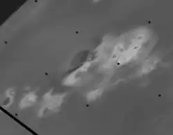 Several eruptions have been observed at Surt since it was discovered by Voyager 1. The first eruption observed by Earth-based astronomers following the discovery of Ionian volcanism took place at Surt on June 11, 1979, between the Voyager 1 and Voyager 2 flybys.[2][5] When Voyager 2 encountered the Jupiter system in July 1979, the eruption appeared to have ceased, but a fresh, 600 kilometres (370 mi)-wide plume deposit was observed surrounding Surt.[4] This plume deposit was suggestive of an active Pele-type plume at Surt between the two Voyager encounters.[2] In addition, dark material, thought to be lava erupted during the eruption, was visible within the eastern half of the patera.[5] When the Galileo spacecraft first took images of the area in 1996, the appearance of Surt and the surrounding terrain had reverted to its appearance as seen by Voyager 1, again suggestive of a short-lived eruption.[3]