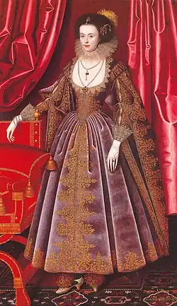 She was appointed First Lady of the Bedchamber to the queen, Henrietta Maria, in 1626, and kept this office for the rest of her life. She was appointed in the midst of the king's purge of the queen's French household. Initially, the queen refused her because she was Protestant. When the king dismissed her French retinue, however, she asked Denbigh to assist her in acquiring the king's consent to let her French nurse Madame de Vantelet stay. Denbigh succeeded in this task by asking her brother to appeal to the king on the queen's behalf, after which the queen voluntarily agreed for her to become her principal lady-in-waiting.[2] As principal lady-in-waiting, she has been referred to as both Mistress of the Robes as well as First Lady of the Bedchamber.