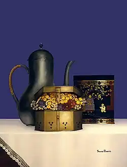 The folk art still lifes of Susan Powers have been compared with the trompe-l'œil works of the well-known 19th-century American academic artist William Harnett. Like Harnett, Powers is fascinated with common everyday objects—books, seashells, bottles, and teapots—and she renders them in a manner so lifelike they ‘fool the eye’ of the viewer, almost leading the viewer to believe that the objects themselves are present on the canvas. The trompe-l'œil technique is uncommon with folk artists: some folk artists cannot produce a photograph-like image.