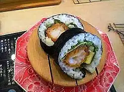 - Futomaki (太巻, "thick, large, or fat rolls") is a large, cylindrical style of sushi, usually with nori on the outside.[36] A typical futomaki is five to six centimeters (2 to 2+1⁄2 in) in diameter.[37] They are often made with two, three, or more fillings that are chosen for their complementary tastes and colors. Futomaki are often vegetarian, and may use strips of cucumber, kampyō gourd, takenoko (bamboo shoots), or lotus root. Strips of tamagoyaki omelette, tiny fish roe, chopped tuna, and oboro whitefish flakes are typical non-vegetarian fillings.[36] Traditionally, the vinegared rice is lightly seasoned with salt and sugar. Popular proteins are fish cakes, imitation crab meat, egg, tuna, or shrimp. Vegetables usually include cucumber, lettuce, and takuan (沢庵, pickled radish).
