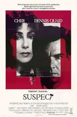 Suspect is a 1987 American legal thriller film directed by Peter Yates and starring Cher, Dennis Quaid and Liam Neeson. Other notable cast members include John Mahoney, Joe Mantegna, Fred Melamed and Philip Bosco.[2]