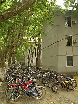 Bicycles in front of a U.S. college dormitory