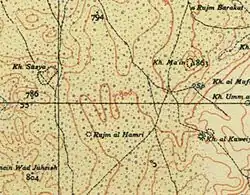 In 1883, the Palestine Exploration Fund's Survey of Western Palestine says "This ruin has also been at one time a place of importance...."[69] In the Survey of Western Palestine, based on an observation in 1874 on the area of the southeastern slope of a hill west of Susya, H.H. Kitchener and Claude Conder noted that "This ruin has also been at one time a place of importance...." They thought the ruins were that of a Byzantine monastery.[69] German accounts later stated that it was a remnant of an ancient church.[70]