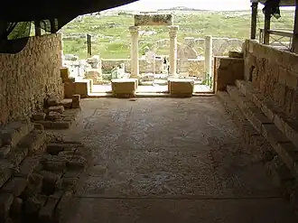 A mosque was built in the courtyard of the former synagogue. It featured a mihrab in the southern wall, a second mihrab between two columns in the southern portico, and "crude" stone benches along the walls.[9] Magness, assessing the evidence uncovered by the several archaeologists who dug at the site, which includes an inscription, dates the mosque to the reign of Caliph Al-Walid I, in the early eighth century.[9]