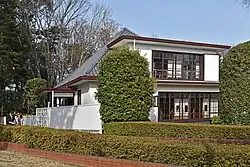 Sutemi Horiguchi (堀口 捨己, Horiguchi Sutemi; 1895–1984) was an architect and a historian of Japanese architecture, and an expert of sukiya-zukuri architecture. In addition to designing modern buildings, he designed buildings in sukiya-zukuri, and buildings that fused both modern architectural and traditional Japanese architectural motifs.