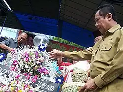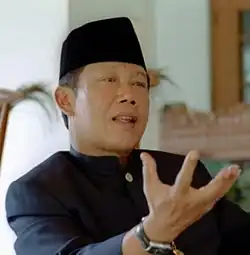 On 6 October 1997, Sutiyoso was appointed as the Governor of Jakarta, replacing Soerjadi Soedirdja.[15] In the Jakarta Regional House of Representatives vote, he defeated Soedirdja's deputy M. Rais and House of Representatives member from Golkar Ahmadi.[16] The move from his residence as Kodam Jaya's commander to the governor's house involved a Betawi parade, with Sutiyoso riding on an andong cart while being escorted by Rano Karno, then an actor famous for his role in Si Doel. Rano also recommended Sutiyoso take on the nickname "Bang Yos".[17]