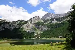 Trnovačko Lake, just outside the park and the borders of Bosnia and Herzegovina, is a glacial lake at an elevation of 1,500 metres (4,900 ft), is 700 metres (2,300 ft) long and 400 metres (1,300 ft) wide set amidst a "huge amphitheater of rocky peaks". The lake is drained from the Maglic, the Volujak, and the Bioc hill ranges. The north side of the lake, which is open, has the wooded Vratnice. The lake water is green-blue.[5][21] The plan is to form another national park within the borders of Montenegro, which should protect the rest of the mountain range of Magilć-Volujak-Bioč and Trnovačko Lake. These two parks in neighboring countries should form one large transboundary protected zone.[2]