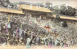 In 1623, Aoki Kensei (1582-1656), a Shugendō priest, came to Nagasaki.[1] With the backing of the bakufu and the Nagasaki's magistrate, land on His religious zeal and skill at organizing, combined with authority granted by the leading Yoshida Shinto council, led to the completion of the main structure of Suwa Shrine in 1626.[1][2] In order to attract attention and encourage attendance at the new shrine, a dramatic yutate-sai ritual, where a priest demonstrates his communion with the kami by plunging his hands into boiling water unharmed, was performed. In spite of this, as well as the sumo match that followed, very few people came to watch.[2]