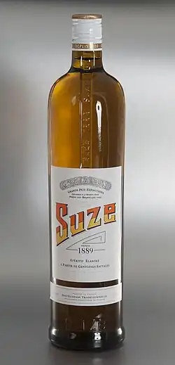 Suze (French pronunciation: [syz]) is a French brand of bitters flavored with the roots of the plant gentian, normally drunk as an apéritif. The brand is owned by Pernod Ricard. It is yellow in color with an ABV of 15%[1] across Europe and a version bottled at 20% for the British market.[2]