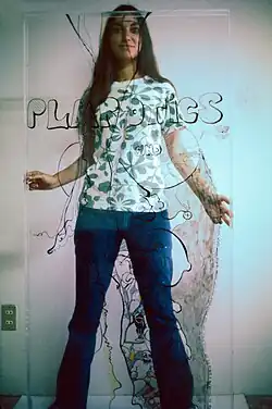 ![]() Portrait of Suzi Ferrer behind "Plarotics" panel. | |