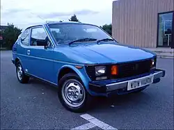 For export, Suzuki transformed the Cervo into the SC100, first introduced in April 1978. It had its European premiere in February 1979, at Amsterdam's AutoRAI.[9] The SC100 was known in the UK by the nickname "Whizzkid". The three-cylinder engine was replaced by a rear-mounted 970 cc four-cylinder F10A engine (later used in the SJ410) developing 47 PS (35 kW).[10] The top speed was 142.8 km/h (89 mph) in a contemporary test.[11] The body differed from the Cervo's in that the windshield was not as steeply raked, necessitating a different doorframe and side window as well. Square headlights were used in European markets, with either round or square ones used elsewhere. In European markets the grille incorporated the chunky indicator lenses, which were normally positioned in a space underneath the bumper – these openings were blanked with plastic grilles.
