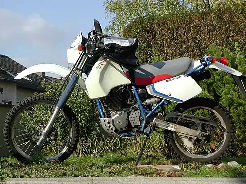 The Suzuki DR350 is a 350cc single cylinder 4-stroke motorcycle produced in both off-road only and dual-sport versions. They were introduced in 1990 and produced until 2001. The DR350S and DR350 were kick start motorcycles until 1994 when the DR350SE was introduced adding an electric start. The engine is an air-cooled 349-cubic-centimetre (21.3 cu in) single cylinder overhead cam (OHC) 4V (four valves per cylinder), with the Suzuki Advanced Cooling System (SACS), dry sump lubrication, 6-speed manual transmission, 21-inch front wheel and 18-inch rear wheel. The brake disc at the front wheel is a single 220mm disc and at the rear wheel is a 200mm brake disc.