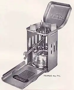 The Swedish-made Primus 71 and the similar Optimus 80 have a larger fuel tank and are slightly taller and heavier than the Svea. (After Optimus acquired the rights to the Primus name for liquid-fueled stoves in 1962, the Primus 71 and Optimus 80 were identical,[34] except for the name and markings.[35]) However, instead of the integrated windscreen on the Svea, the Primus 71 and Optimus 80 stoves fit inside a sheet-metal case for transport that when opened serves as the stove's windscreen and pot support. The type of fuel used and the method of operation of the Primus 71 is the same as the Svea.[36] The Primus 70 is similar, but with a cylindrical aluminum container instead of a sheet-metal box.[36] The Radius 42, another Swedish-made stove, dates from the 1920s and is slightly smaller than the Primus 71, but is otherwise the same general design.[37]