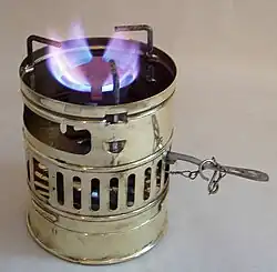 To light the stove, the fuel tank must first be pre-heated and pressurized by lighting a small amount of fuel poured into the primer pan or spirit cup (a small well) on top of the tank at the base of the vaporizer (the vertical stem connecting the fuel tank to the burner). Alternatively, the primer pan can be filled directly from the fuel tank by opening the control valve and warming the fuel tank by holding it in one's hands. This will increase the pressure in the fuel tank and force a small amount of fuel to trickle out of the burner jet and into the primer pan.[18] The control valve must then be closed before lighting the priming fuel so as to allow pressure to build up in the tank when the exterior fuel begins to heat the tank and the fuel within. The tank can also be pressurized by an optional pump that may be attached to the filler cap, but this is generally not necessary except in extreme cold. Fuel from the tank is fed by a cotton wick inside the tank to the base of the vaporizer. The heat and pressure created by the priming flame vaporizes the fuel inside the vaporizer. When the priming flame is nearly burnt out, the control valve is opened by turning the adjusting key. This allows the vaporized fuel to flow under pressure through the burner jet (a small opening at the base of the burner), where it mixes with oxygen and burns with a blue flame. Adjusting the flow of the vaporized fuel that is forced through the burner jet controls the flame size and heat output. The control valve (a spindle) is threaded in the vaporizer's housing, and as it is opened (by turning the adjusting key) it opens like a faucet (counter-clockwise to open and clockwise to close) and the vaporized fuel flows through the burner jet. Closing the spindle closes the fuel supply. A small plate on the top of the burner (a flame spreader) spreads the flame outwards. The heat generated in the burner and vaporizer maintains the internal pressure in the fuel tank.[19][20]