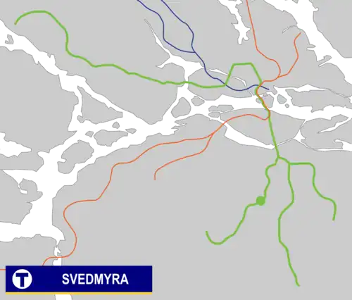 Svedmyra metro station is on the Green line of the Stockholm metro, located in Stureby, Söderort. The station was inaugurated on 1 October 1930 as part of the stretch between Gullmarsplan and Stureby.[2] The distance to Slussen is 5.2 km (3.2 mi).