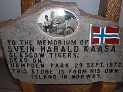 There is a memorial made from Norwegian stone at the Glasgow Tigers track in his memory.[1]