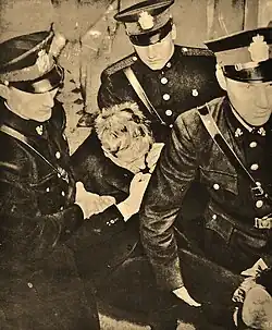 After two years of direct civilian administration by the Germans, Riisnæs was one of nine Norwegians signing the declaration on 31 January 1942 which disbanded Parliament and directed Quisling to formally take over the powers of government. As Minister of Justice, Riisnæs was responsible for changing the Norwegian legal system to legitimize the Nazi actions, and authorized the persecution of those who would not cooperate with the German occupiers.[3] Riisnæs was a driving force in the deportations of Norwegian Jews, which primarily took place in the fall of 1942. While his earlier writings primarily consisted of legal and forensic texts, he produced a number of books and articles expressing his Nazi convictions during the war,[2] and also held public speeches against Norwegian Jews.[4][5]