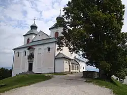 St. Judoc's Church was first mentioned in documents relating to the bequest of land by Emperor Otto II to the Bishops of Freising in 973. The earliest surviving part of the church is the gothic sanctuary in which frescos by Jernej of Loka dated to 1530 are preserved. The remainder of the church dates to the 18th century, when it was rebuilt in the Baroque style. The surrounding buildings were greatly damaged in the Second World War. The church used to be an important pilgrimage church, and is still a popular hiking destination.[7]
