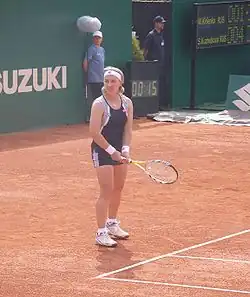 Kuznetsova reached the third round of the singles competition at the Australian Open, before losing to top seed Justine Henin. She reached her second major doubles final with new partner Elena Likhovtseva before losing to Virginia Ruano Pascual and Paola Suárez.[20] Several weeks later, playing singles at Dubai, Kuznetsova defeated former world No. 1, Venus Williams, in the quarterfinals before defeating world No. 8, Ai Sugiyama, in the semifinals for her first win over a top-10 player. Kuznetsova lost the final to world No. 1 Henin.[21] The following week, Kuznetsova defeated Henin for the first time in the semifinals of Doha, before losing in the final to compatriot Myskina in three sets,[22] pushing her into the top 20 for the first time. In April, Kuznetsova reached her third singles final of the year at the start of the clay-court season at the J&S Cup in Warsaw, losing to Venus Williams in the final.[23] Kuznetsova climbed to No. 11 by the time of the French Open. There, she reached the fourth round before losing to eventual champion Myskina, after holding a match point in the third set. In doubles Kuznetsova and Likhovtseva reached the final, losing to Suarez and Ruano Pascual.[24] Following the French Open, Kuznetsova climbed to career-highs of world No. 9 in the singles rankings, her first time in the top ten, and on 7 June 2004, world No. 3 in the doubles rankings. Kuznetsova won her third title at the Eastbourne International, defeating Hantuchová in the final in three sets.[25] At Wimbledon, Kuznetsova suffered a first-round loss to 118th–ranked Virginie Razzano.[26] She fell to No. 4 in the doubles on 26 July, losing in the LA Women's Tennis Championships to 113th ranked Gisela Dulko and Patricia Tarabini.