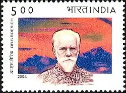 He won the Grand Prix of the Sesquicentennial Exposition in Philadelphia in 1926. He lived for many years in India where Jawaharlal Nehru awarded him the International Award and the Padma Bhushan. His paintings of Nehru and Indira Gandhi, adorn the historic Central Parliament Hall in New Delhi. He was married in 1945 to an Indian movie star Devika Rani, who was once married to producer Himanshu Rai and known as "The First Lady of the Indian Screen". Roerich was born a citizen of the Russian Empire, but became stateless after the Bolshevik Revolution. Resident in India since the 1930s, Roerich became an Indian citizen on 21 March 1960.[5] Roerich died in 1993 at the age of 88 and is buried in Bangalore, India.[6]