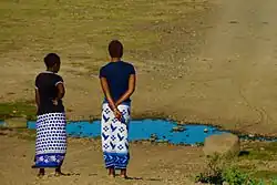 Women wearing Kangas with Swahili sayings and geometric designs in Moshi, Tanzania