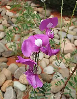 Swainsona greyana, commonly known as the Darling pea or hairy-Darling pea,[2] is a species of flowering plant in the family Fabaceae and is endemic to south-eastern continental Australia. It is an erect perennial subshrub with imparipinnate leaves with 17 to 21 egg-shaped leaflets, and racemes of 12 to 20 or more white, pink or purple flowers.