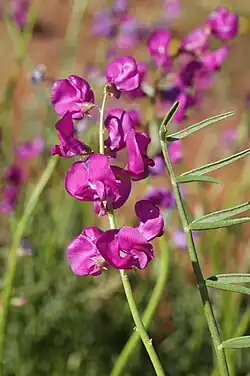 Swainsona purpurea, commonly known as purple Swainson-pea or purple Darling pea,[2] is a species of flowering plant in the family Fabaceae and is endemic to arid areas of inland Australia. It is an erect or spreading annual or perennial plant with imparipinnate leaves with 3 to 11 mostly linear or elliptic leaflets, and racemes of 3 to about 20 purple flowers.