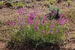 Swainsona purpurea grows in low-lying areas or on dunes, often near the edges of salt lakes and is widespread in inland Western Australia and South Australia, and in adjacent areas of the Northern Territory, Queensland and the far west of New South Wales.[2][5][4][9]