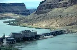 Built 124 years ago in 1901 to generate power, Swan Falls is the oldest hydroelectric dam on the Snake River. In the 1990s, the original power plant was replaced.[1] The dam was built with fish passage facilities, but they proved to be very poor in performance. For this reason, among others, the C. J. Strike Dam, built upriver from Swan Falls in the early 1950s, was not equipped with fish passage facilities. Thus, the two dams combined to become the first artificial barrier to anadromous fish migration up the Snake River. Today, Hells Canyon Dam (1967) is the first total barrier to fish migration on the Snake.[4]