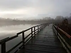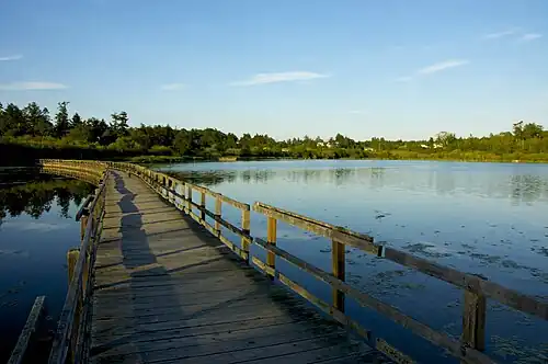 The wharves and floating boardwalk were originally built by members of the Canadian military. The floating boardwalk offered an unprecedented level of access to the lake water, a facility unique in the Capital Region. It quickly became the focus of many of the education programs, providing opportunities for bird-watching and lake water studies. The original floating boardwalk was in place until 2018, when it was decided that in order to accommodate the winter water levels in the lake and keep visitors safe, a new, longer boardwalk was to be constructed in two phases. The new boardwalk was unveiled in October 2018 to a fanfare of community support. In 2020, the South Wharf was removed.[2]