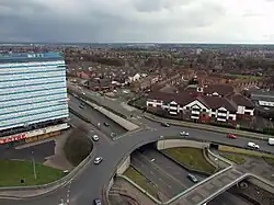 With its landmark high rise building, it stands on the A45 Coventry Road at its intersection with the A4040 Outer Ring Road (also the Birmingham Outer Circle Number 11 bus route), known as Swan Island.
