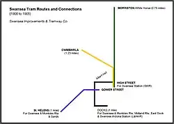 In 1905, following a failed attempt to take over the tramway, Swansea Corporation won the right to build several new lines but had to give the running powers to the SITC.[4] Glamorgan County Council, meanwhile, built an extension northwards from Morriston to Ynysforgan (intended to be a new system to Pontardawe but never completed) for which the SITC also provided the cars and electric power.[4] Three further short extensions followed in 1913 promoted by the SITC to link between some of the existing tracks to permit more route variation giving the final route pattern used from then until closure in 1937.