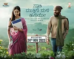 Swathi Mutthina Male Haniye is a 2023 Indian Kannada-language romantic drama film written and directed by actor-director Raj B. Shetty.[1] It was co-produced by actress Ramya under her home production studio, AppleBox Studios, in collaboration with Shetty's Lighter Buddha Films.[2] It featured Raj B. Shetty and Siri Ravikumar in the lead roles.[3] The music is scored by Midhun Mukundan. Both editing and cinematography are done by Praveen Shriyan.