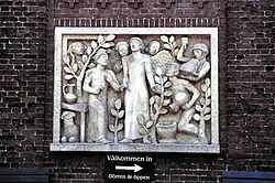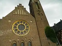 The church is designed in the Jugendstil style and is built in a hard-burnt brownish brick. The complex includes church halls, a community centre, offices, a rectory, staff houses, archives and storage rooms.[3] The exterior wall contains a relief designed by the Danish artist Henrik Starcke (1899–1973).[6]