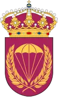 The coat of the arms of the Swedish Army Paratroop School (FJS) 1952–1994. Blazon: "Azure, a spread-out parachute with five cords inside an open chaplet of laurel, all or."[9] The coat of arms of the Swedish Paratrooper Training Corps (FJS) 1994–2000 and the Swedish Parachute Ranger School since 2000. Blazon: "Purple, a spread-out parachute with five cords inside an open chaplet of laurel, all or".[9]