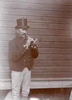 The Swedish cowhorn (Swedish: kohorn) is a primitive musical instrument constructed from the natural horn of livestock. The instrument has no separate mouthpiece and is blown similarly to a trumpet but with much greater force. There are two types of traditional cowhorns: one without finger holes for scaring off bears and wolves while herding livestock in the forest ("tuthorn") and one with three or four finger holes for calling the domestic animals or other people ("vallhorn"). The cowhorn was used in the Swedish transhumance or fäbodkultur, an ancient system of moving the cattle to remote summer pastures, thus making more efficient use of scarce resources. This was mostly women's work, which is why women excelled at cowhorn playing. Different melodies carried different meanings such as "one of my cows is missing" or "stop looking, your cow is here". Cows, sheep and goats would have each their own melody which made them come back from their foraging. Cowhorns were also played for entertainment, for dancing or for devotions. A testimony of its long-standing tradition, the oldest extant Swedish cowhorn with finger holes dates to the 6th century.