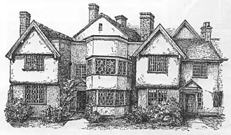 The hall is a timber-framed, black-and-white, two-storey building under a tiled roof.[35] The original plan had a central hall with two cross wings, a typical rural mansion layout which is similar to that of Churche's Mansion.[2][7][38] One cross wing (east) would have been the parlour, the other (west) the service wing, including a buttery and kitchen. The projecting pentagonal wing was added to the end of the central hall in the late 16th or early 17th century.[7][16]