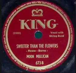 "Sweeter than the Flowers" is a country music song co-written by Ervin T. Rouse, Morry Burns, and Syd Nathan. It was sung by Moon Mullican and released on the King label. In May 1948, it reached No. 3 on the Billboard folk best seller and juke box charts.[1] It was also ranked as the No. 9 record on Billboard's 1948 year-end folk record sellers chart.[2]