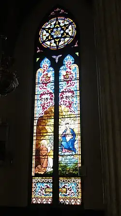 The church includes several impressive stained glass windows created by Detroit Stained Glass Works,[3][7] the successor to the well known firm of Friederichs and Staffin.[8] The major transept window illustrates the Holy Family in Saint Joseph's workshop. Eight windows lining the nave portray Christ, Mary, and several saints; this set of windows won a major prize at the 1893 World's Columbian Exposition in Chicago.[3]
